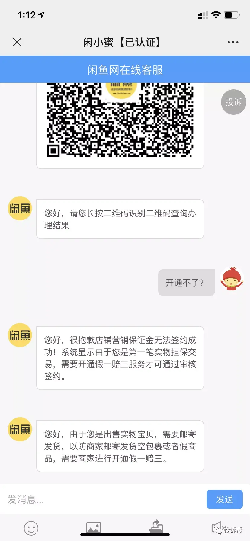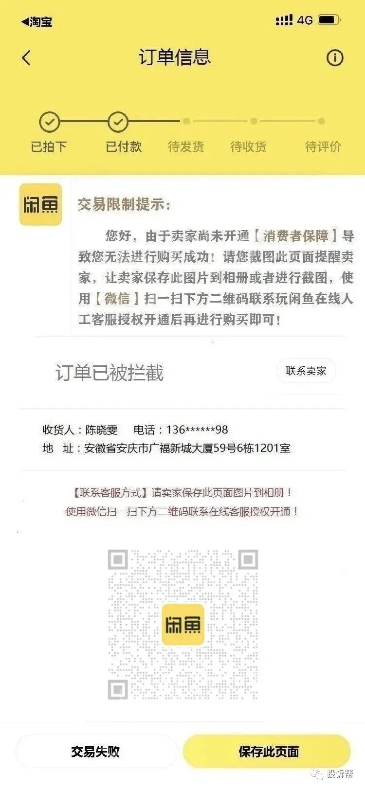 “我在闲鱼上挂了我们的两件衣服,就有人通过淘宝的平台找到我说要买。但是在下单的时候,他就说出现了问题,因为我没有开通什么消费者权益。”