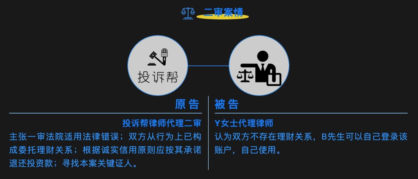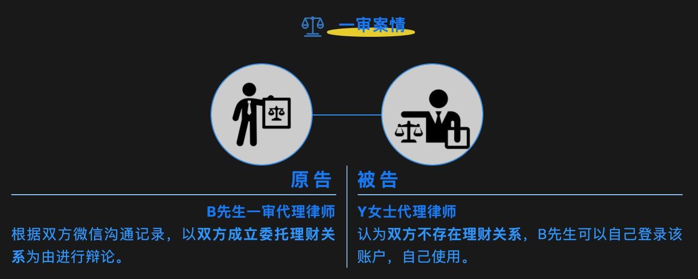 B先生的一审代理律师根据双方微信沟通记录,以双方成立委托理财关系为由进行阐述与辩论。但由于在理财关系中完全由Y女士全权负责该理财产品,事实上B先生并不能登录自己的理财账号。在微信聊天记录中,Y女士曾承诺“即便平台不在了,我也会个人赔偿”。