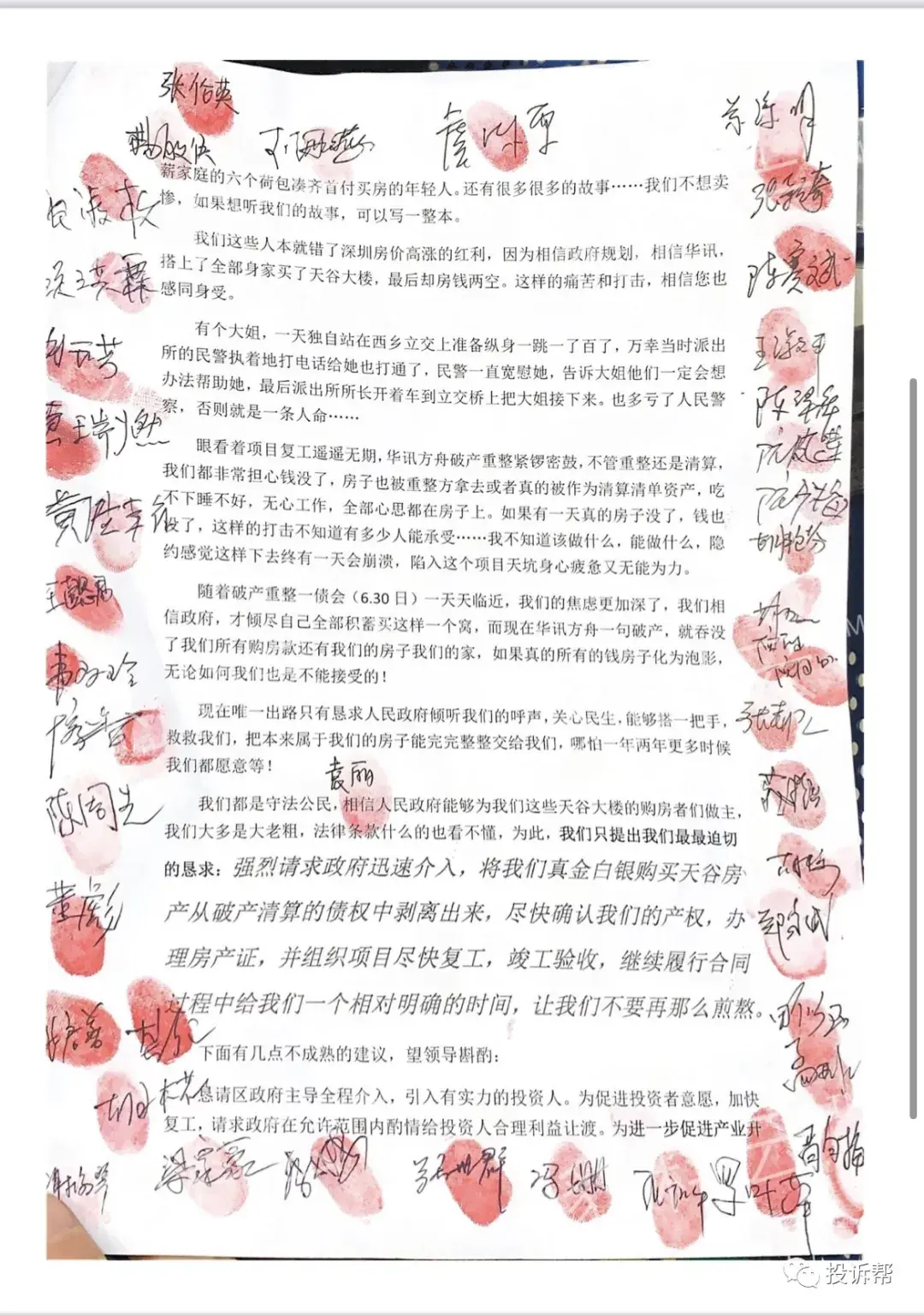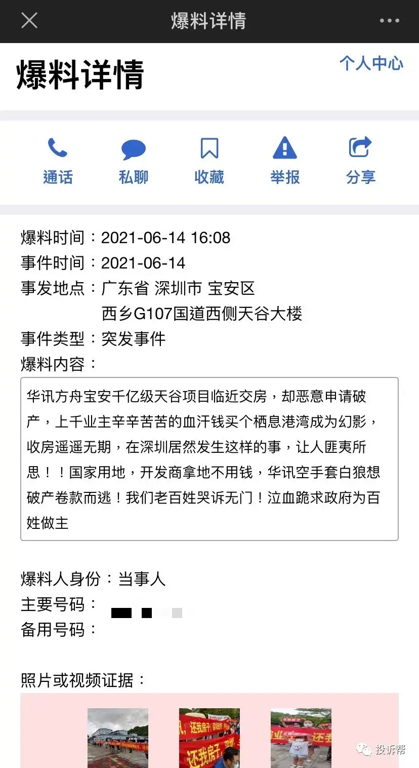 “华讯方舟宝安千亿级天谷项目临近交房,却恶意申请破产,上千业主辛辛苦苦的血汗钱买个栖息港湾成为幻影,收房遥遥无期,在深圳居然发生这样的事,让人匪夷所思!”