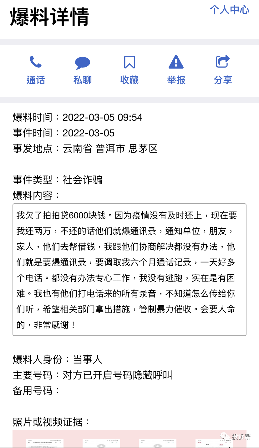 “我欠了拍拍贷6000块钱。因为疫情没有及时还上,现在要我换两万,不还的话他们就爆通讯录,通知单位、朋友、家人,他们去帮借钱,我跟他们协商解决都没有办法,就要调取我六个月通话记录,一天好多个电话。都没有办法专心工作,我没有逃跑,实在是有困难。……”