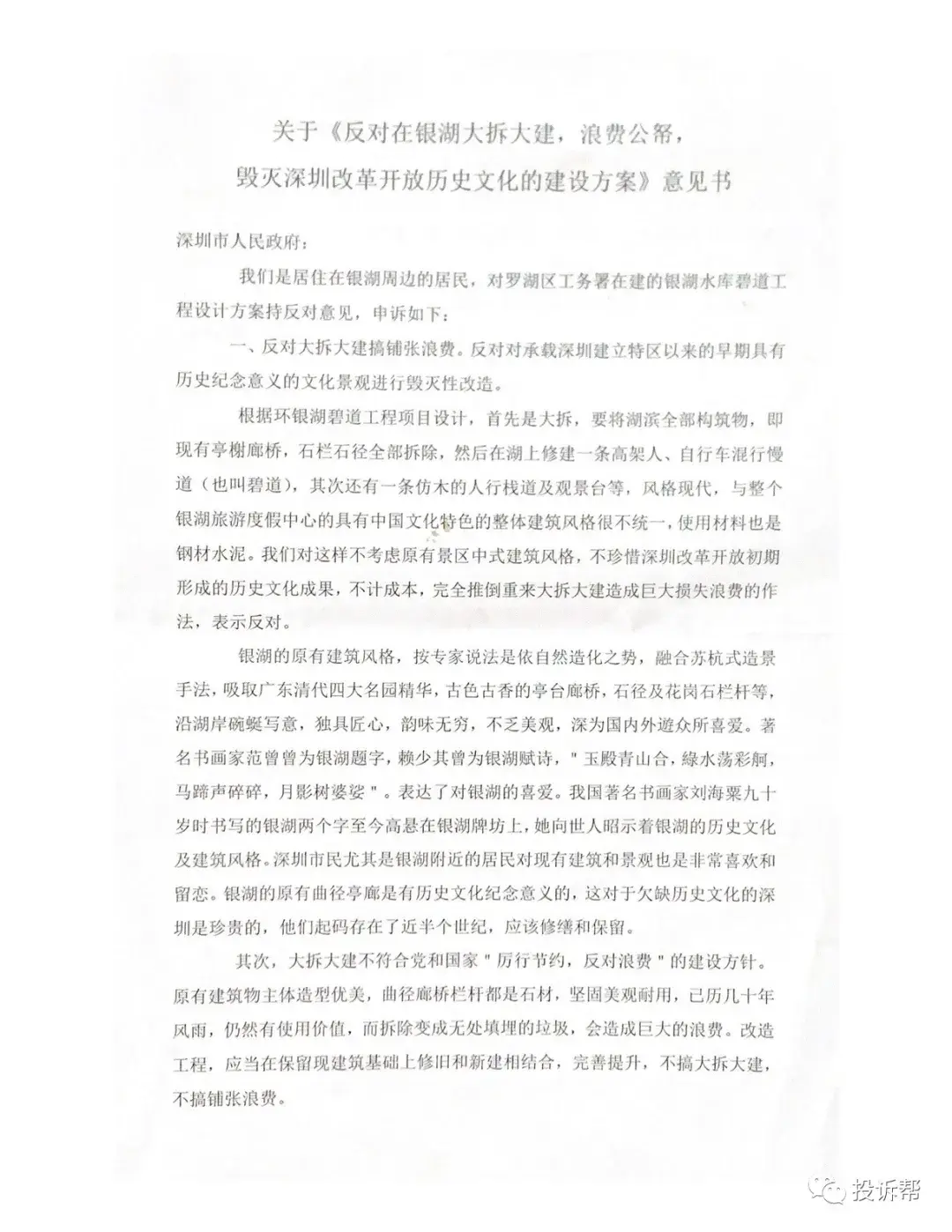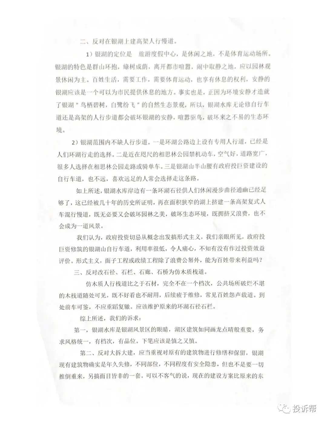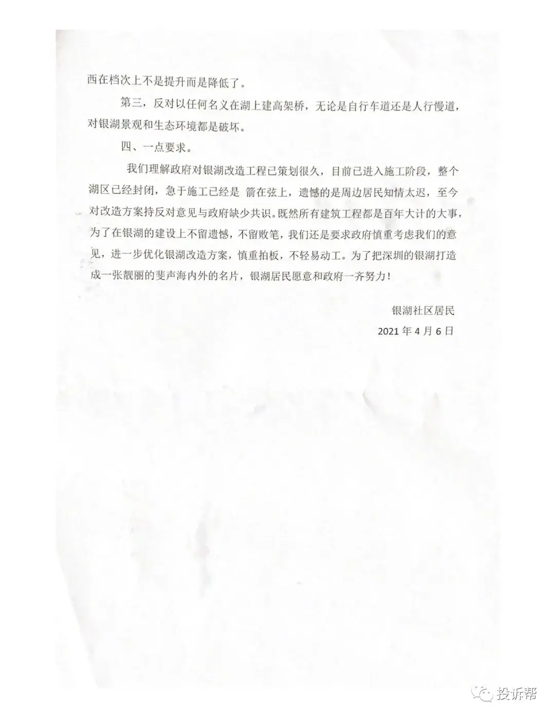 三、目前虽然已进入施工阶段,但由于居民知情太迟,仍希望在银湖建设上不留遗憾,恳请慎重考虑居民意见。