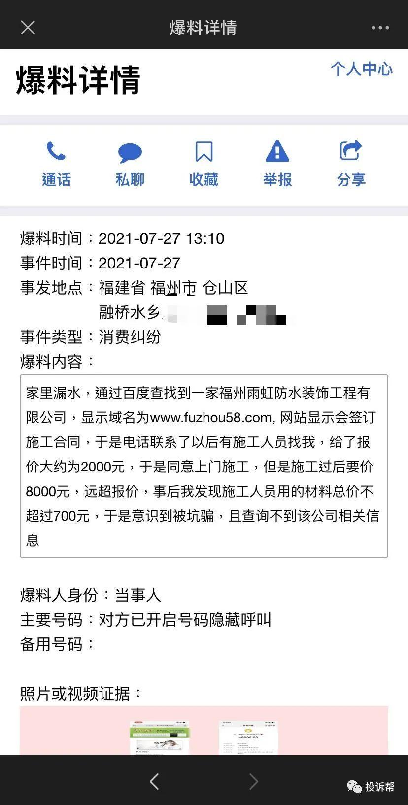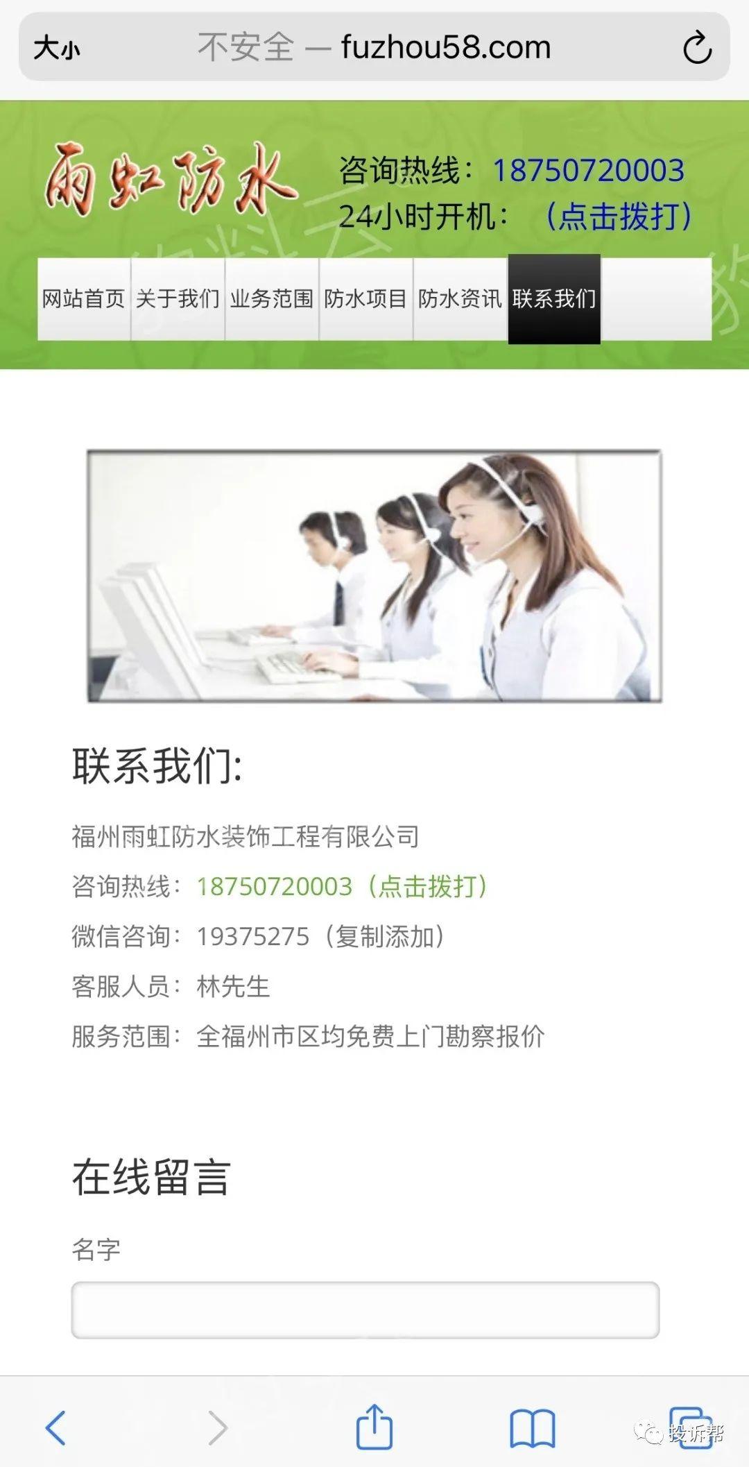 对于防水,H先生无疑是一个外行人,但他看到这家雨虹防水的网址是fuzhou58.com,乍看之下还以为是58同城旗下公司,网站上服务范围还写着“全福州市区均免费上门勘察报价”。第一家啄木鸟没给报价,但是这家雨虹防水现场就给H先生报了价。