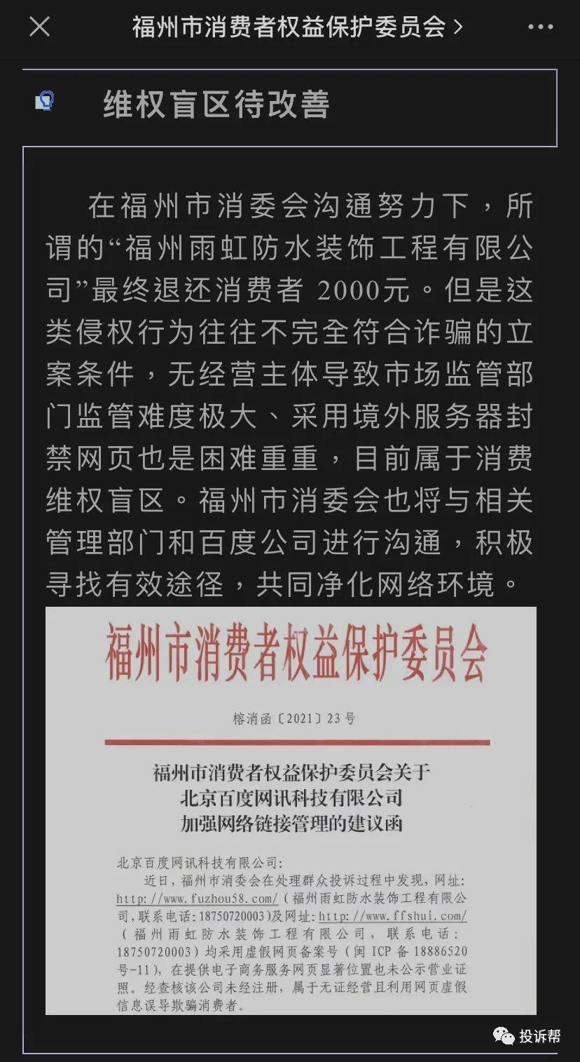 “依据《中华人民共和国电子商务法》,电子商务经营者应当在其首页显著位置,持续公示营业执照信息、与其经营业务有关的行政许可信息。经查该网页未公示任何证照信息,从国家企业信用信息公示系统也无法查询到“福州雨虹防水装饰工程有限公司”的相关注册信息,网页的备案号:闽ICP备18886520号-11在工业和信息化部政务服务平台ICP/IP地址/域名信息备案管理系统中也无法查询。如此三无网站竟然在消费者用百度搜索时,获得以“百度快照”形式的推荐,令人难以置信。”